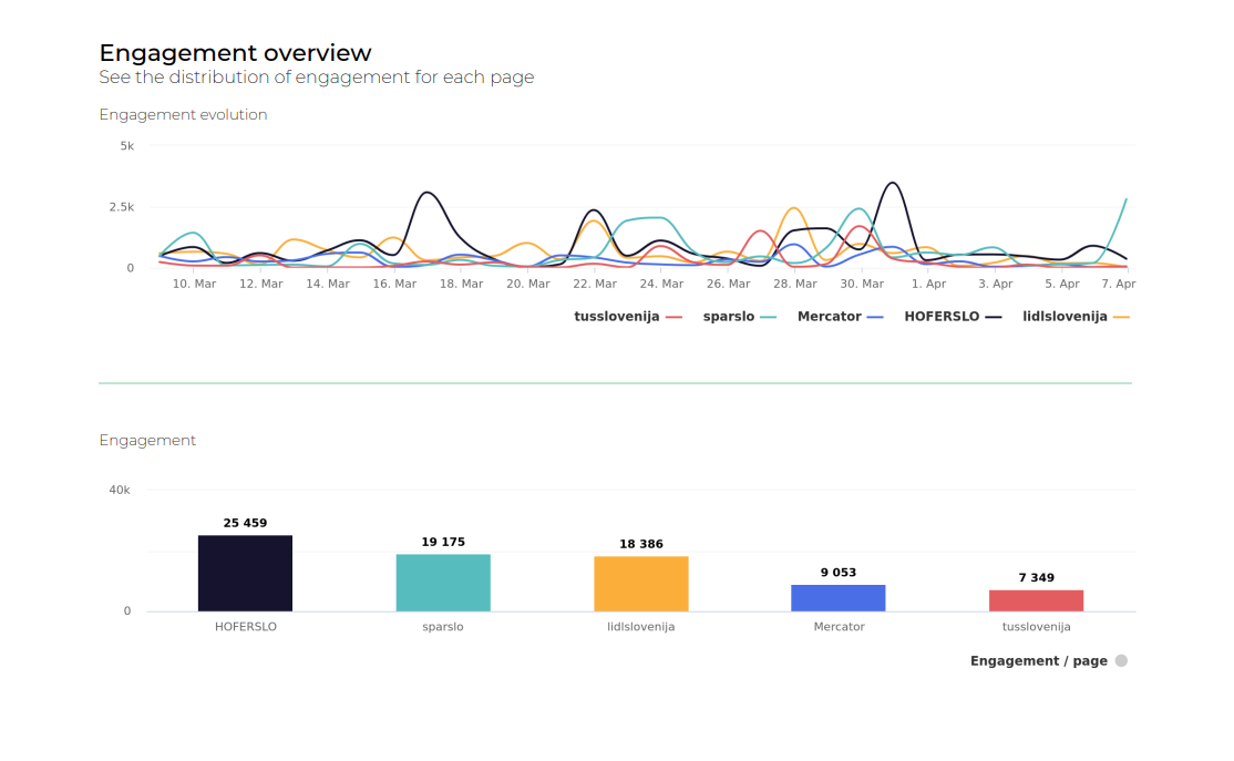 Pridobite vpogled v aktivnosti konkurence na družbenih omrežjih in primerjajte uspešnost.