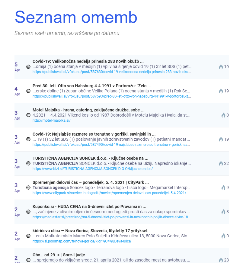 Spletni kliping vam omogoča, da spremljate vse, kar se omenja o vas, vaših izdelkih in storitvah - na spletu in družbenih omrežjih. Spremljanje omemb vas redno seznanja s trendi na trgu in vsem, kar je povezano z vašim podjetjem. Dnevna, tedenska in mesečna poročila direktno na vaš e-mail naslov.